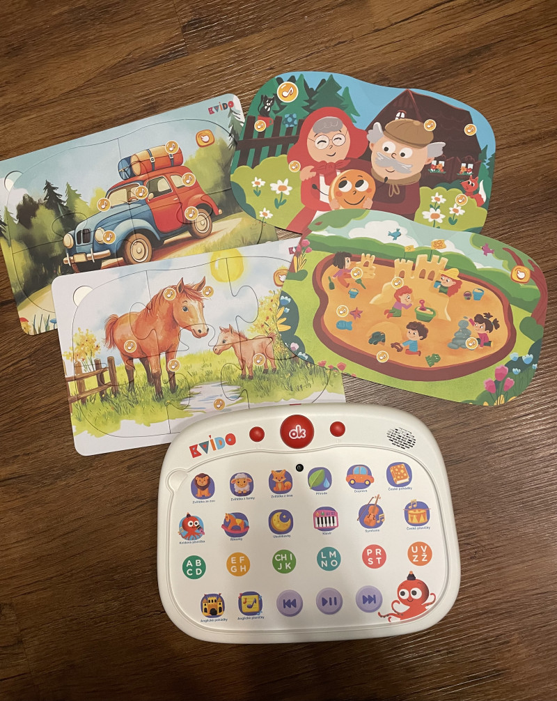 Velkým plusem je podle testerek kvalita zpracování a odolnost – tablík je pevný, lehký, snadno přenosný a dobře se dětem drží. Díky tomu se hodí nejen na domácí hraní, ale i na cesty nebo třeba na víkend k babičce. Maminky také vyzdvihly široké spektrum aktivit: více než 300 zvuků, puzzle, karty, pohádky i písničky v češtině a angličtině. Děti si tak mohou vybírat podle nálady a věku, a hračka je stále baví.