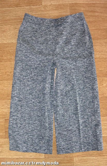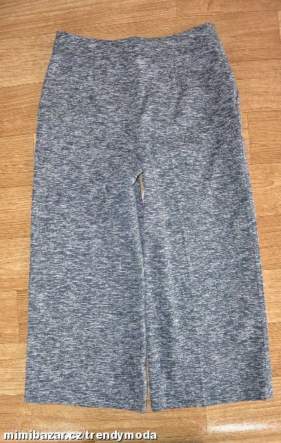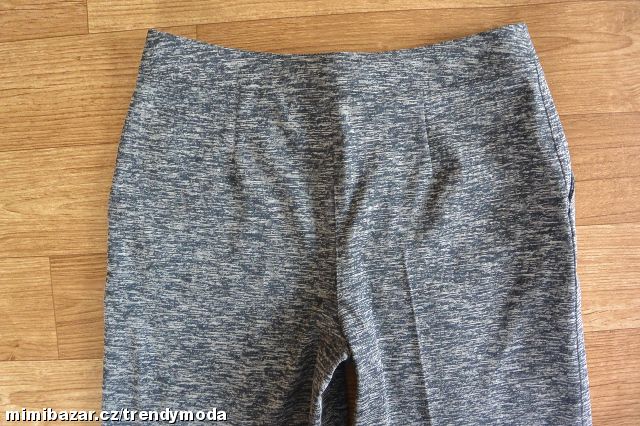 Asi nové, bez vad. Šedý melír, pružná látka. Pas 38-40 cm, délka 80 cm, vnitřní délka 53 cm, stehno 31,5 cm, sedy 28/31 cm, boky 51-57 cm, nohavice dole 29 cm.