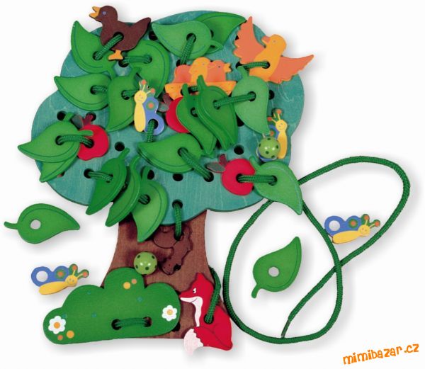 Prodám krásnou dřevěnou hračku, podporuje rozvoj jemné motoriky, představivost a kreativitu - pomocí provlékacích tkaniček se zdobí strom - zvířátky, lístečky, jablíčky...
