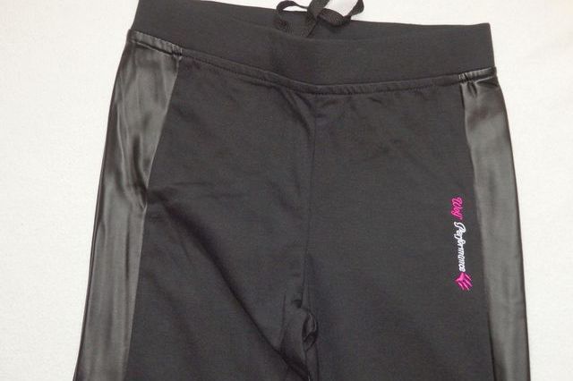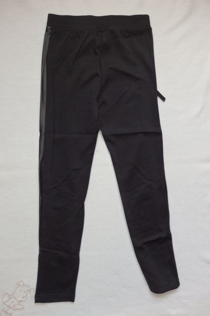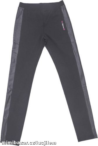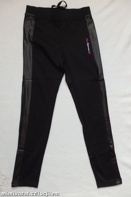 Moc pěkné dívčí kalhoty černé barvy, jsou jednoduchého střihu, přilnavé na tělo, v pase do široké gumy, uvnitř je protažená šňůrka pro případné dotažení v pase. Nemají kapsy, na levé nohavici mají malý nápis a co kalhoty dělá opravdu hezkými jsou pruhy po stranách, černé barvy, které na první pohled vypadají jako kožené, ale zdání klame, kůže to samozřejmě není.
