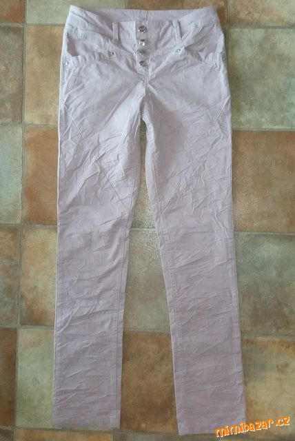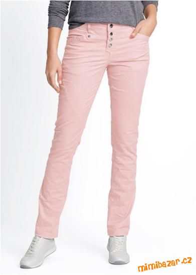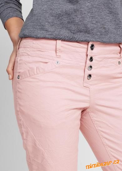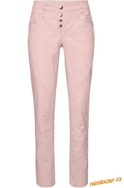 Módní kalhoty v lehkém mačkaném vzhledu s knoflíkovou légou, barva matně růžová, pas s poutky na pásek, střih straight, úzce střižená nohavice s rovnou dolní partií (Straight Leg), mají čtyři kapsy a zapínají se pomocí knoflíků.