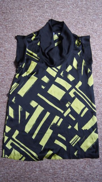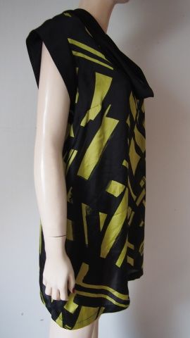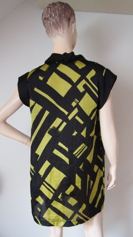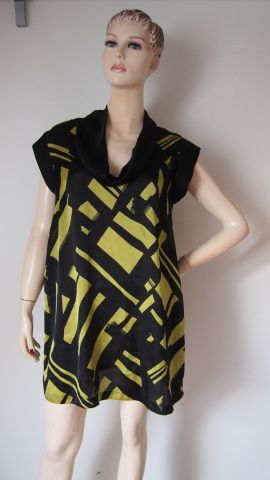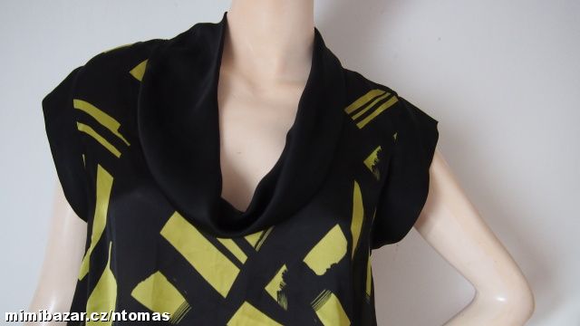 Jako nové, moc pěkné. Z příjemného saténu. U dekoltu nařasená voda. Velikost 40, délka: 79, š. dole: 59, boky: 58, pas: 53, průramky, prsa: 50 - 51, rukáv od krku / dole: 18 / 1 cm. Mat. polyester
