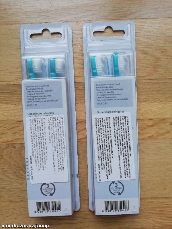 Nové zatavené balení čtyř hlavic v blistru. Možno obě velikosti - pro menší děti 3+ (HX6034/33) i pro větší děti 7+ (HX6044/33), nafoceno na posledním detailu