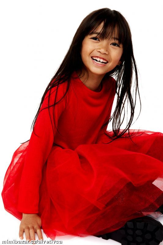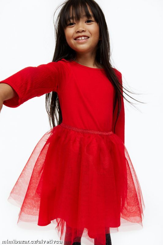 Dívčí velurové šaty s dlouhým rukávem. Mají průstřih s knoflíkem vzadu u krku. V pase šev a třpytivá páska. Lesklá sukně z několika vrstev tylu vytváří objem. Sukně má podšívku.