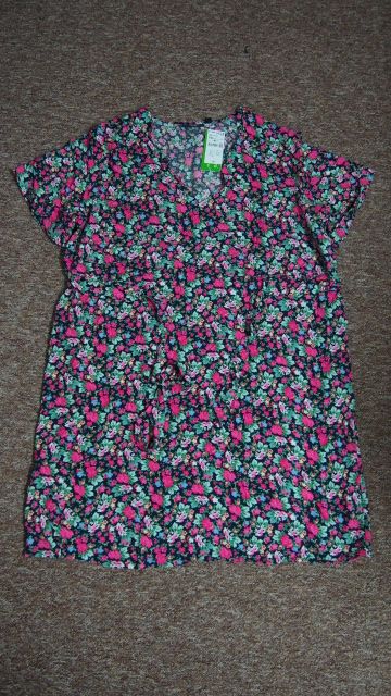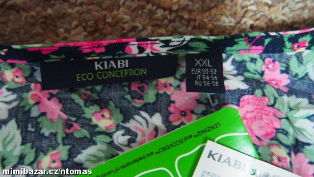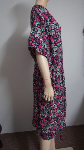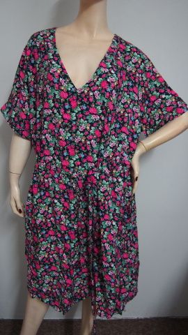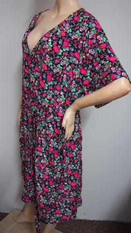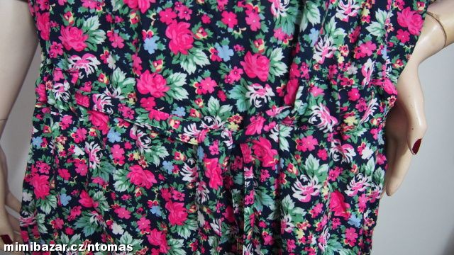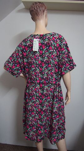 Moc pěkné, nové s cedulkami. Volný střih - jemné, elegantní, s romantickými květy. Na bocích jsou kapsy. Skvělý, jemný materiál - splývavé. V pase zavazování skrytým tkalounem v barvě látky. Velikost XXL -52 - 52, délka: 100, š. dole: 79 - 83, boky: 67 - 73, pas: 62 - 65, průramky, prsa: 69- 74, rukáv od krku dole: 37 / 10 cm. Mat. viskoza