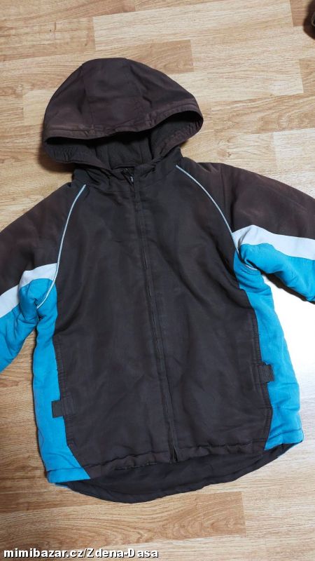 Pěkná hnědo-modrá bunda a kapucí vel. 110