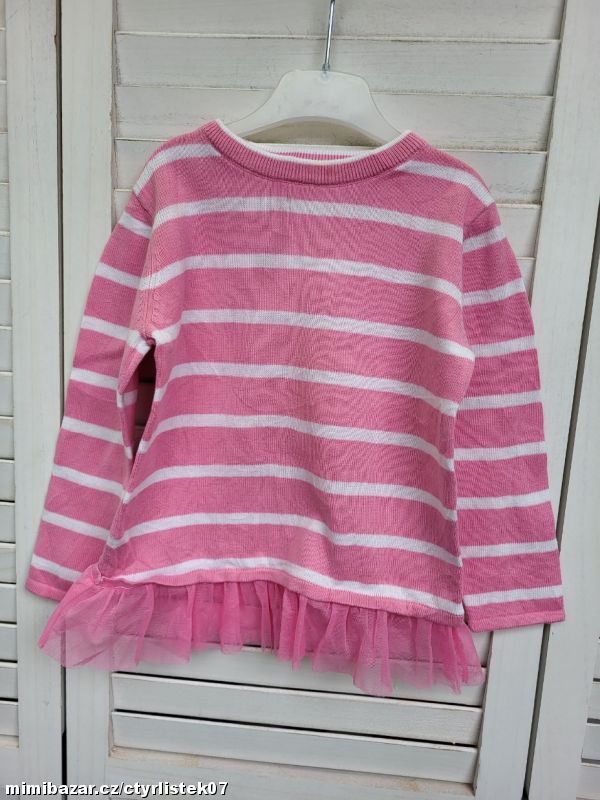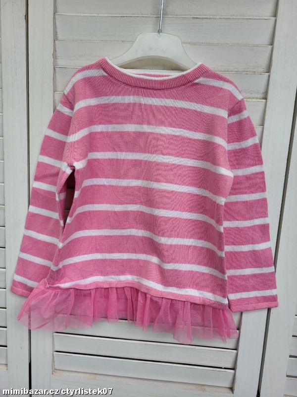 DÍVČÍ SVETR, SVETŘÍK, PŘÍZE, MAT. 100% BAVLNA, SÍŤOVINOVÝ VOLÁNEK - MAT. 100% POLYESTER, RŮŽOVO-BÍLÝ, NEPOUŽITÝ BEZ VISAČKY POUZE U KRKU NEPATRNÝ FLÍČEK - UŠPINĚNO MANIPULACÍ