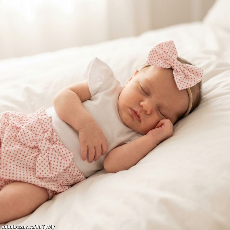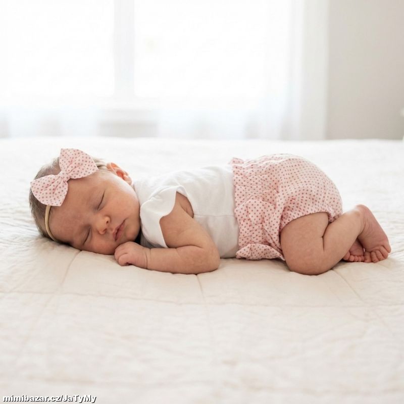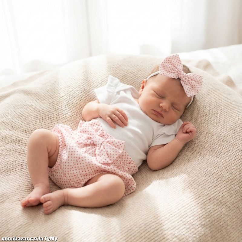 Soupravička obsahuje body s krátkým rukávem, kraťasy a čelenku s mašličkou