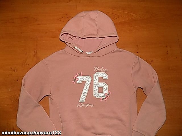 Pořád moc pěkná Primark, delší mikina, po jednom dítěti, kapuce podšitá bavlněným úpletem, vpředu klokanka, pěkný stav, d. 61 cm, š. 44 cm, d. rukávu 59,5 cm- 89 kč