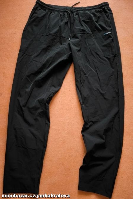 Pánské společenské kalhoty, řekla bych sportovně - elegantní, s jemným proužkem, barva cernomodra. Jako nové. Velikost 52. Manželovi bohužel malé. Pas 47 cm, přední sed 26 cm, délka 102,5 cm.