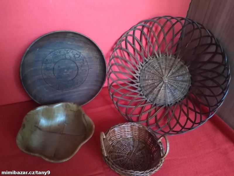 Dva proutěné košíčky, dřevěný talíř s řezbou, miska z lakovaného asi bambusu-145kč