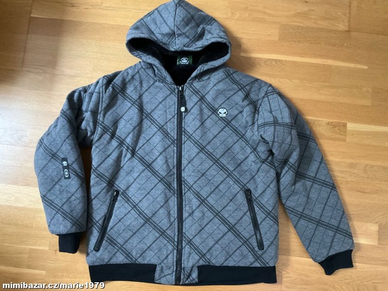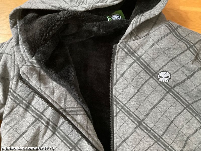 Šedá - No fear - s kožíškem. Malinko žmolíky, jinak pěkný stav. Šíře pod průramky - 51 cm, délka zad od kapuce 58 cm, délka rukávu od kapuce 64 cm. 150,- Kč