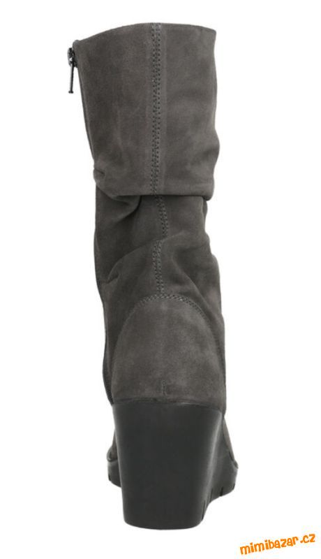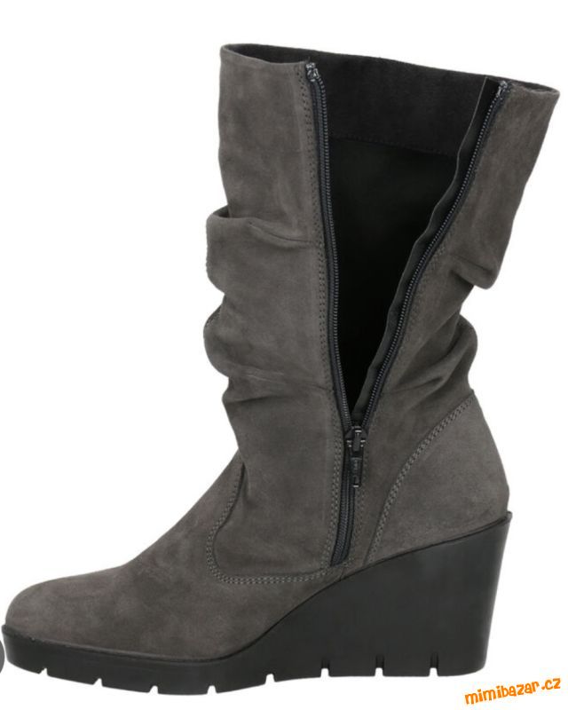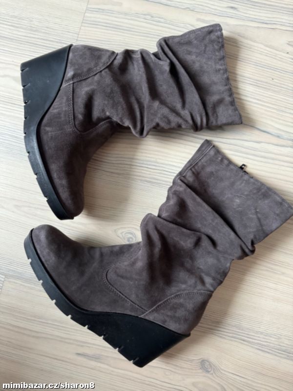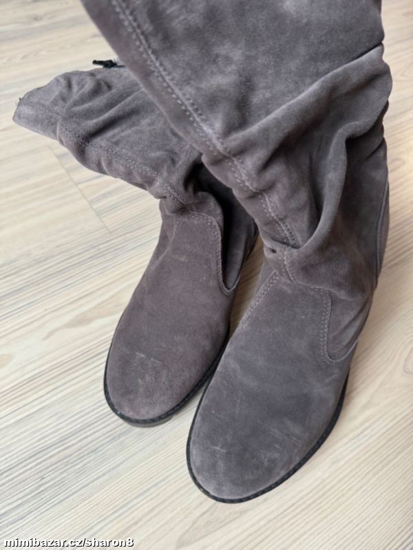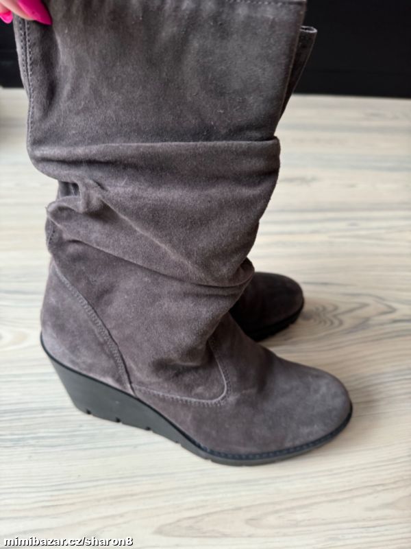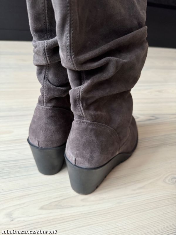 Prodám nenošené semišové kozačky, šedá brousena kůže, na klínku a nízké platformě, uvnitř vyteplené, na pohodlném klínku, velikost 38, v
