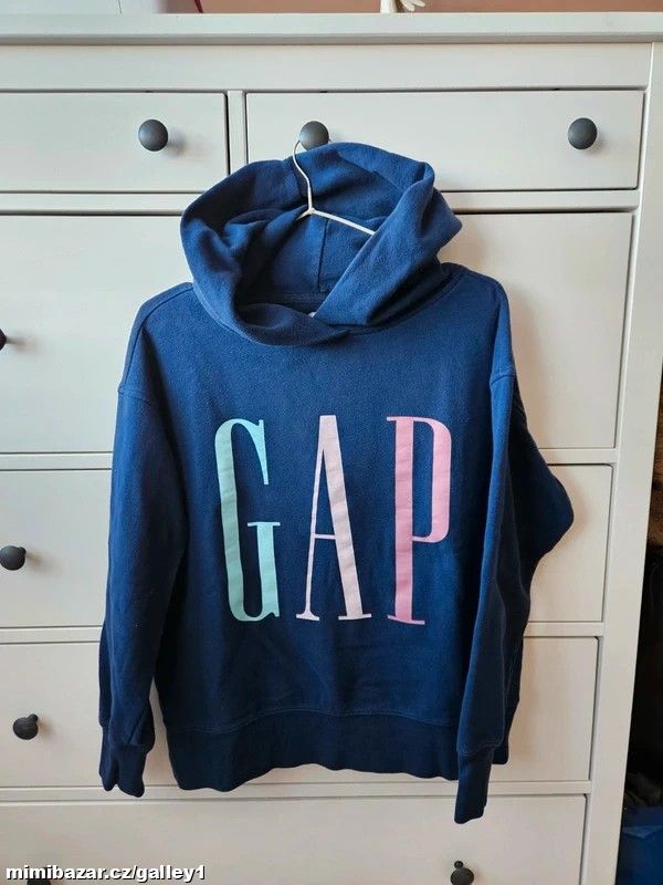 Mikina GAP s logem, kapuca, zapínání na zip s kapsami, velikost 2 roky ale vydržela déle, kupovaná nová, krásný stav, jako nová