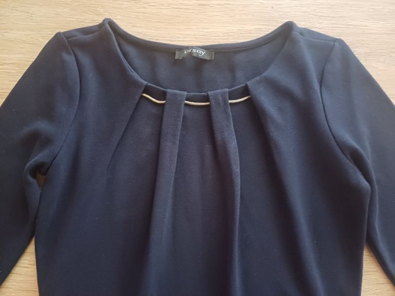 Prodám tmavě modré triko/blůzka s 3/4 rukávem, přední díl s řasením,moc hezké,v super stavu, šíře v průramcích 41 cm,délka 58 cm,pas 33 cm,pruží,materiál bavlna,elasthan,kupované v Orsay..Neměním.Pouze prodej.