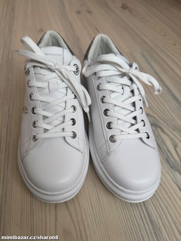Prodám nové bílé kožené tenisky, limitovaná edice, stříbrný nápis, vzadu na patě třpytky, krásné, jen doma vyzkoušené, pc 4800,-