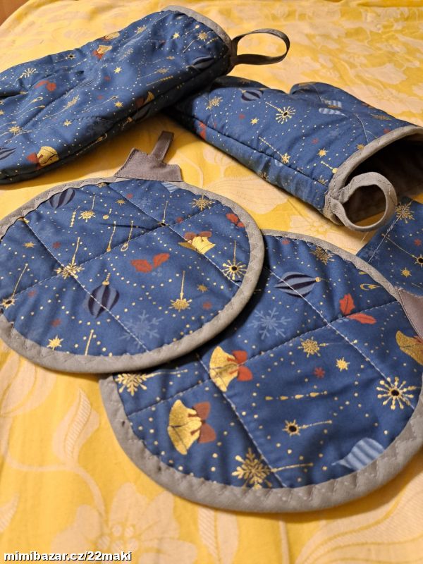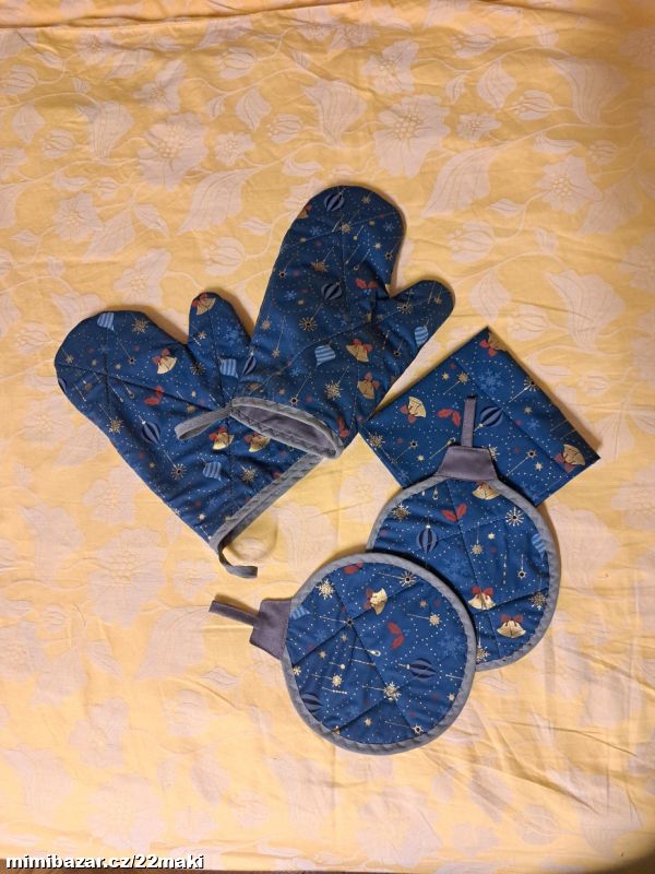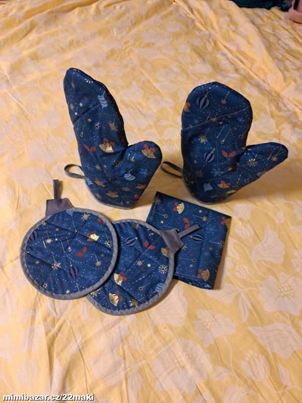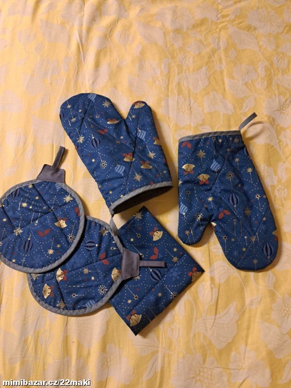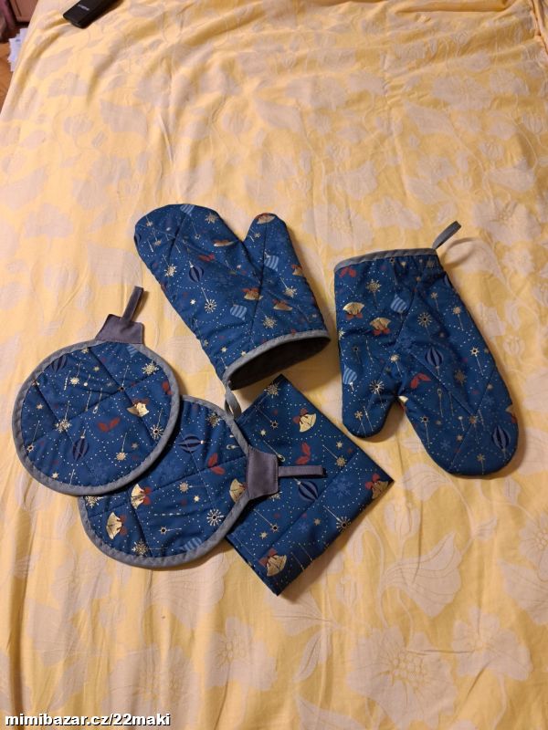 Modré chňapky baňky, rukavice, ubrus,