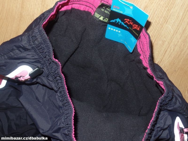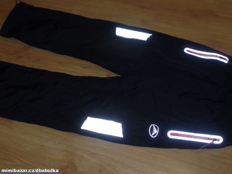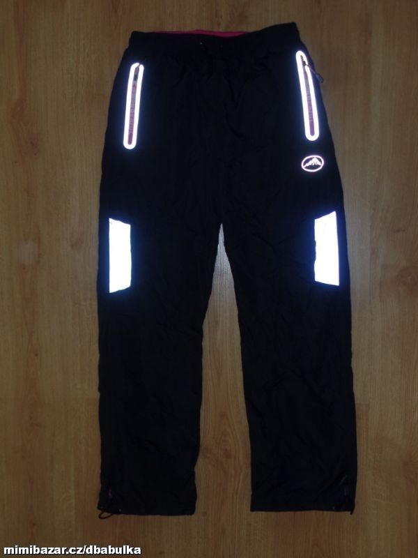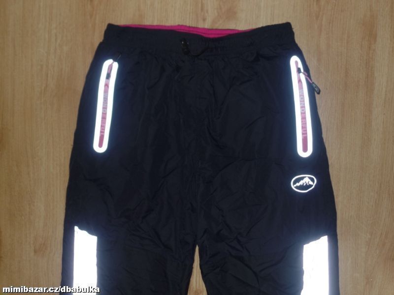 materiál kvalitní šusťák, podšité fleesem, v pase na stažení na olivku, boční kapsy na zip, dole nohavice na stažení na olivku, reflexní prvky, na zimu jsou super :-) barva hodně tmavě šedá + černá kolena