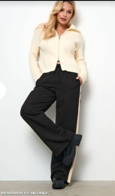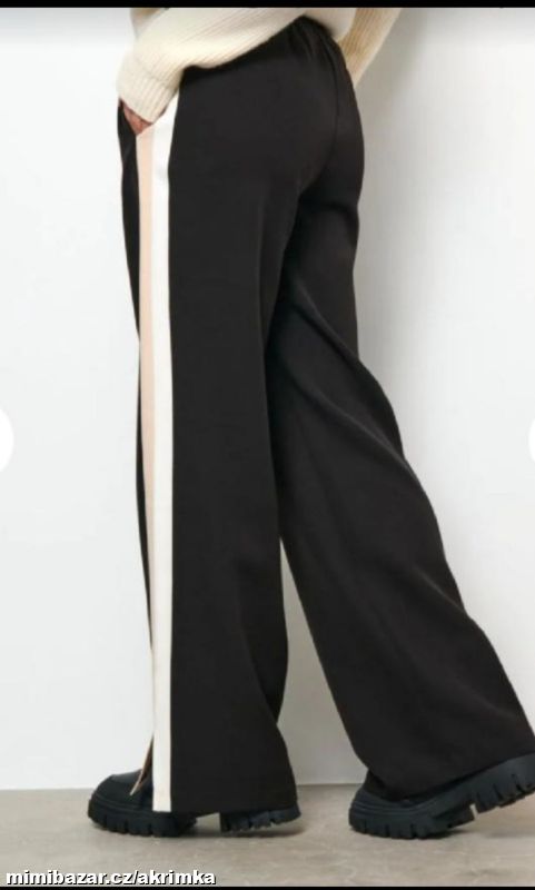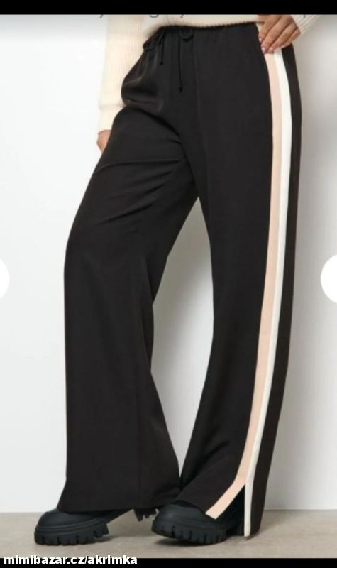 Nové včetně visačky. Nadělil mi Ježíšek ale jsou mi velké. Sytě černé barvy v kombinaci s lampasem v bílo béžové. Pěkně propracované a pohodlné, lehce pružné. Mají kapsy. Fajn jako běžné kalhoty. Pas na 82-max.96cm, boční délka 107cm s 10cm rozparky..…