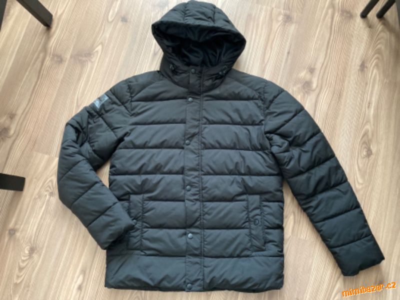 Kvalitní, teplá, černá, nošená méně, výplň v pořádku, zapínání na zip a patentovou légu, kapsy na patenty, kapuce napevno, šňůrky funkční, spodní šev patentové légy 4, 5 cm vypáraný, drží to, při nošení si nevšimnete. Jinak bez vad.