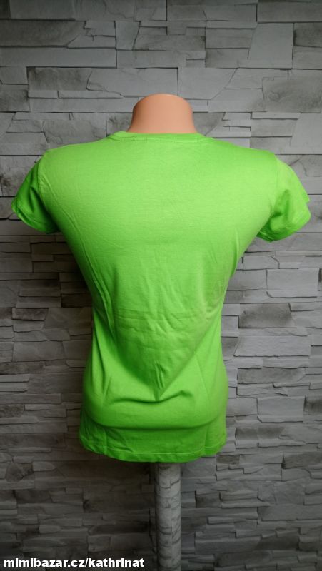 Zelené tričko s krátkým rukávem. Rozměry: prsa 2x 44-52cm, délka 60cm. Materiál: bavlna. V pase 3malé flíčky (na první pohled jsem je nezaregistrovala), jinak top stav.