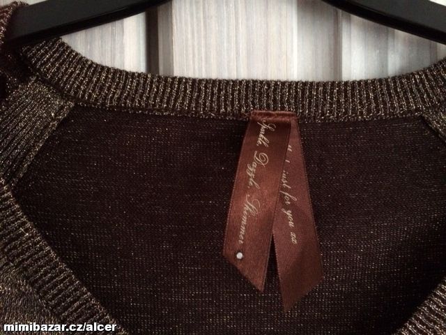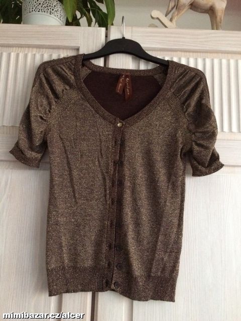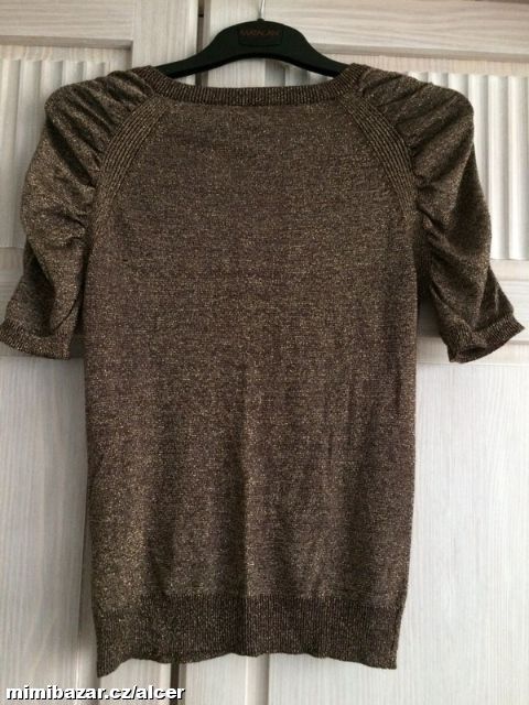Nadherny, mozno nosit svatecne i na bezne noseni. Kratky jemne nabirany rukavek. Barva hnedo/zlata . 75% viscoza,14% polyester,8% metaluzed fibre.