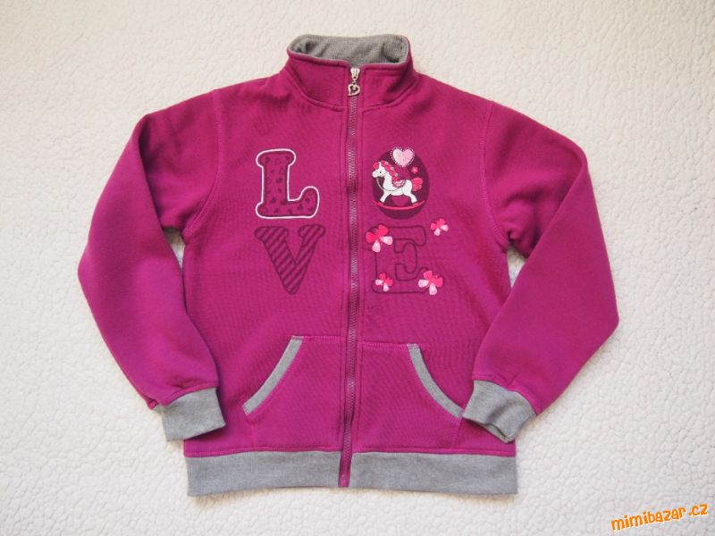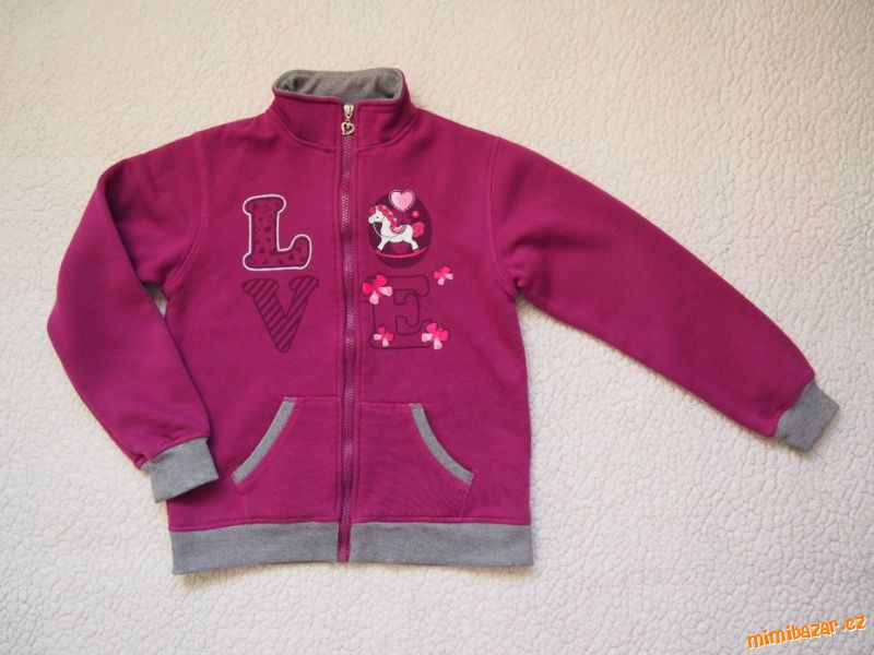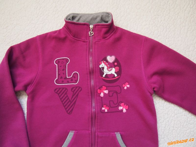 V HEZKÉM STAVU. Teplejší mikina vínovo-šedá, nápis Love a poník, zapínání na zip až po stojáček, klokanková kapsa, konce mikiny a rukávů do úpletu. Uvnitř teplejší chloupek.