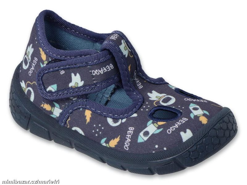 Chlapecké bačkůrky Befado s velmi lehkou, prodyšnou, protiskluzovou a velmi ohebnou podrážkou, zpevněná pata a boky pro správnou stabilizaci chodidla - vyvinuto ve spolupráci s dětskými ortopedy. Zapínání na suchý zip okolo kotníku. Dva otvory na špičce, aby se nožička tolik nepotila.