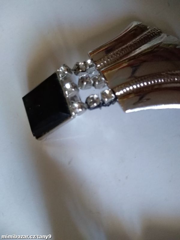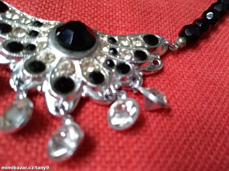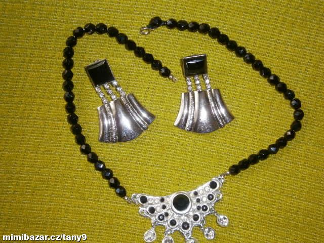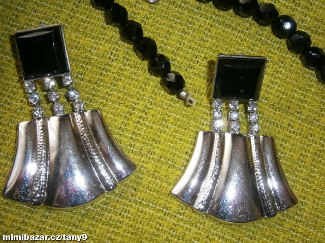 Retro souprava náhrdelníku a náušnic, kov, sklo. U jedné náušnice je navázání u štrasu nitkou a u náhrdelníku chybí dva krajní závěsky-145kč