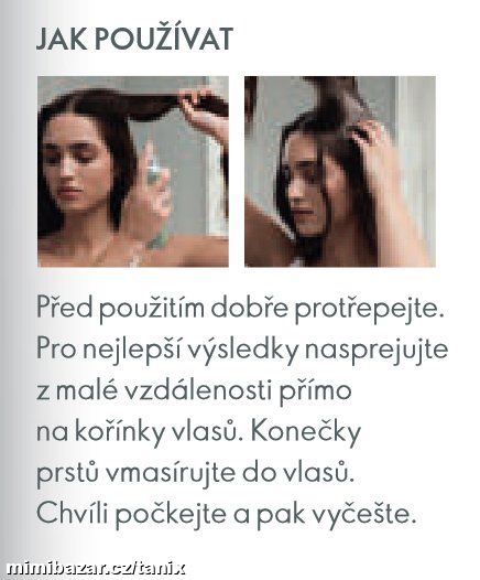 Před použitím dobře protřepte. Pro nejlepší výsledky nastříkejte z krátké vzdálenosti přímo ke kořínkům vlasů. Konečky prstů přípravek do vlasů rovnoměrně vetřete, chvíli počkejte a pak vyčešte.