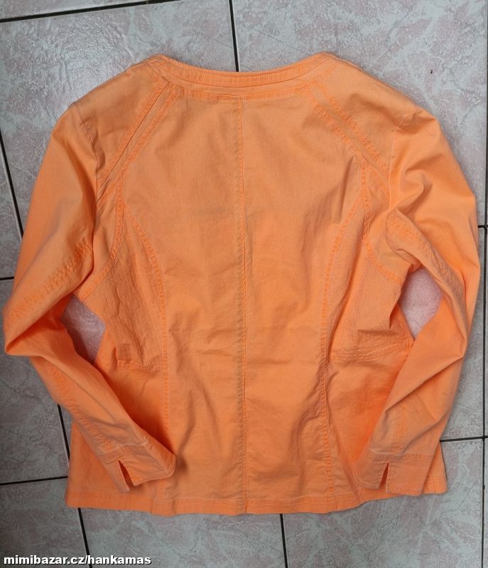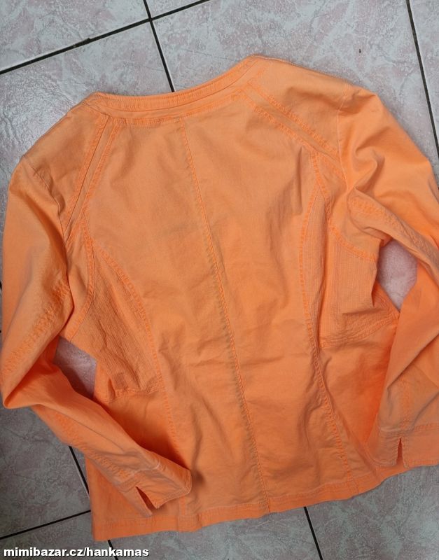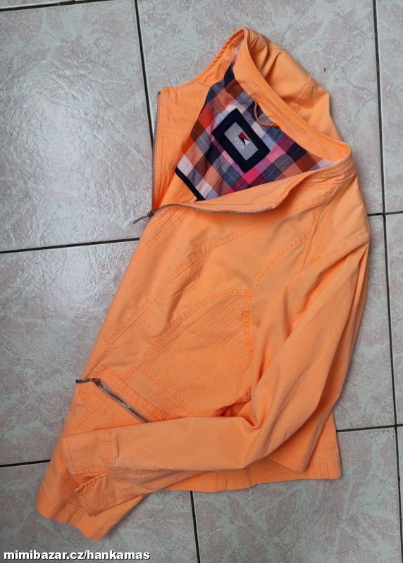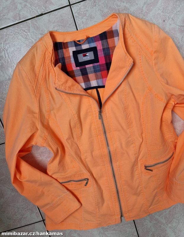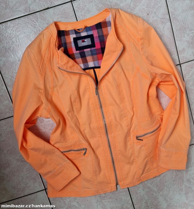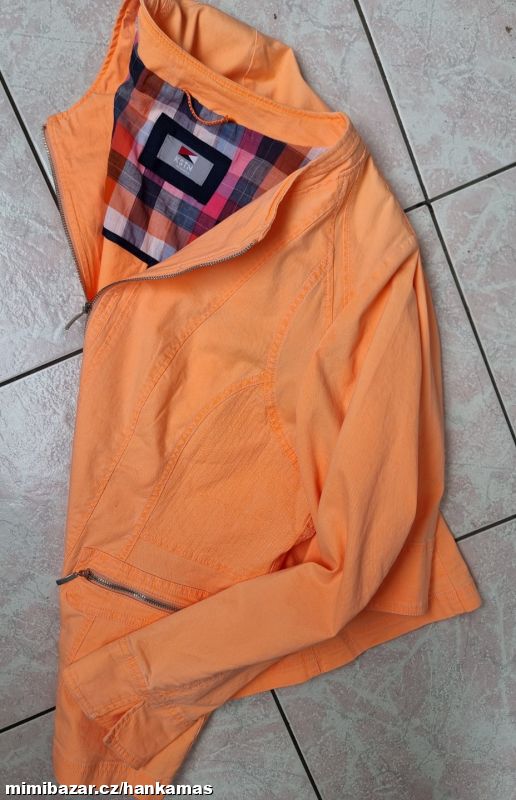 Bunda má nádhernou neon meruňkovou barvu,je šitá v pohodlném a slušivém sportovně-elegantním střihu, šitá z měkkého, pružného materiálu. Zapínání na zip, kapsy na zip. Perfektní stav, na oko jako nová, bez známek nošení. Materiál 98% bavlna +2% elastan. Celková délka 69cm, šířka pod průramky 60 au 65cmx2, pas cca 56,5 až 60cmx2, šířka dole 64 až 68cmx2, délka rukávu od krku 73,5cm, od prošití v rameni 62,5cm .