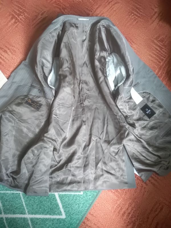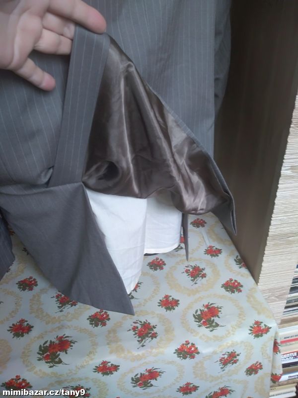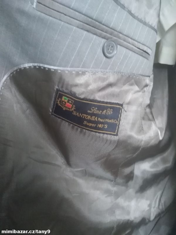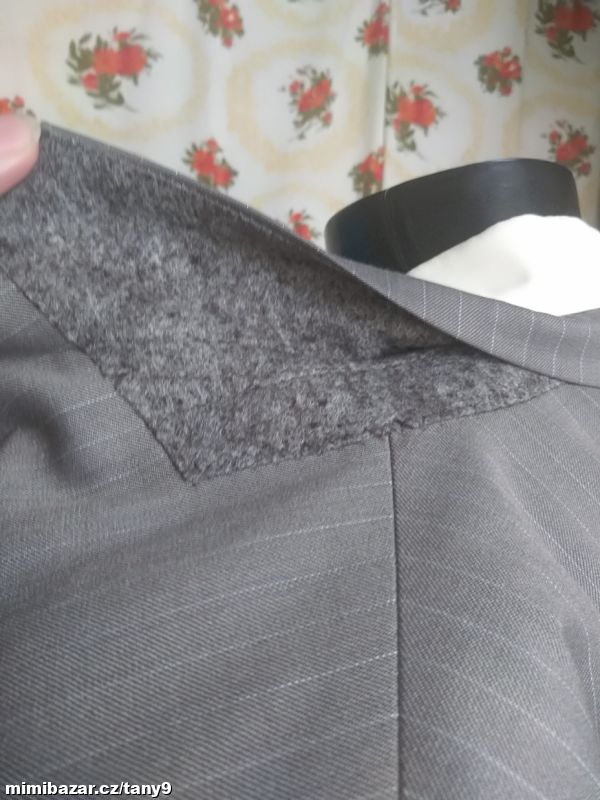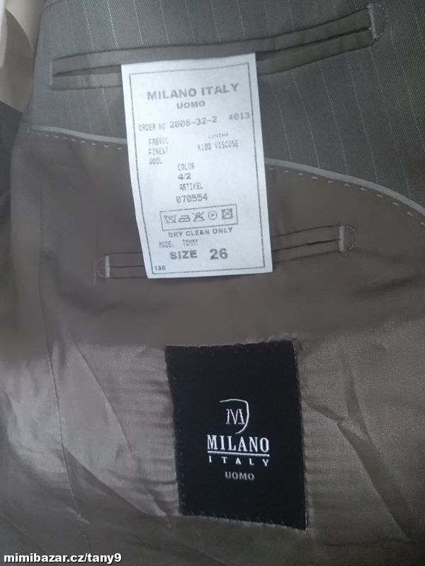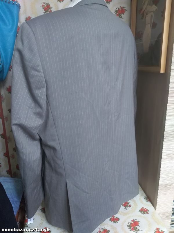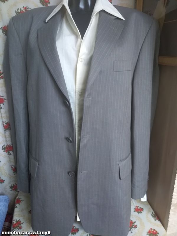 Šedé sako s jemným proužkem zn. Milano Italy Uomo. Čtyři vnitřní kapsy, z toho dvě menší, dvě venkovní kapsy s klopou. Na tři knoflíky, na rukávech ozdobné knoflíky. Vycpávky. Materiál je kvalitní, měkký a příjemný na nošení-viz foto. Nošené minimálně. Vel. se píše 26-míry d-78cm průr.-59cm pas-56cm ruk.-65cm mezi rameny-49cm.
