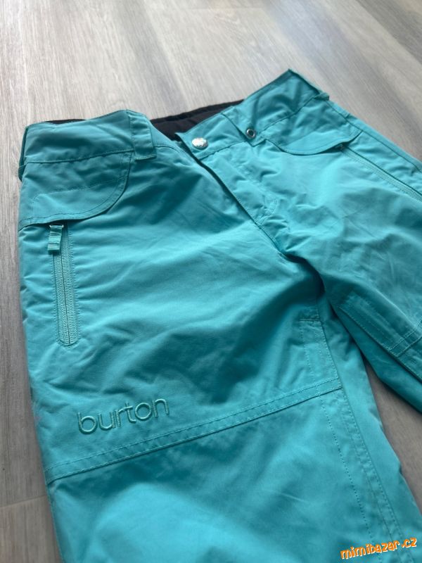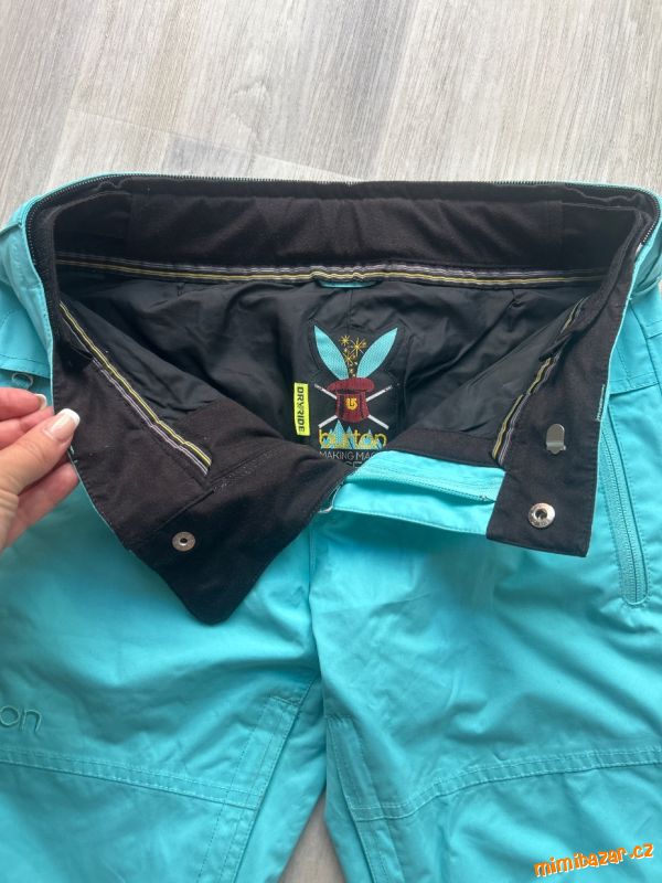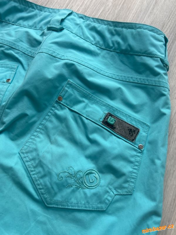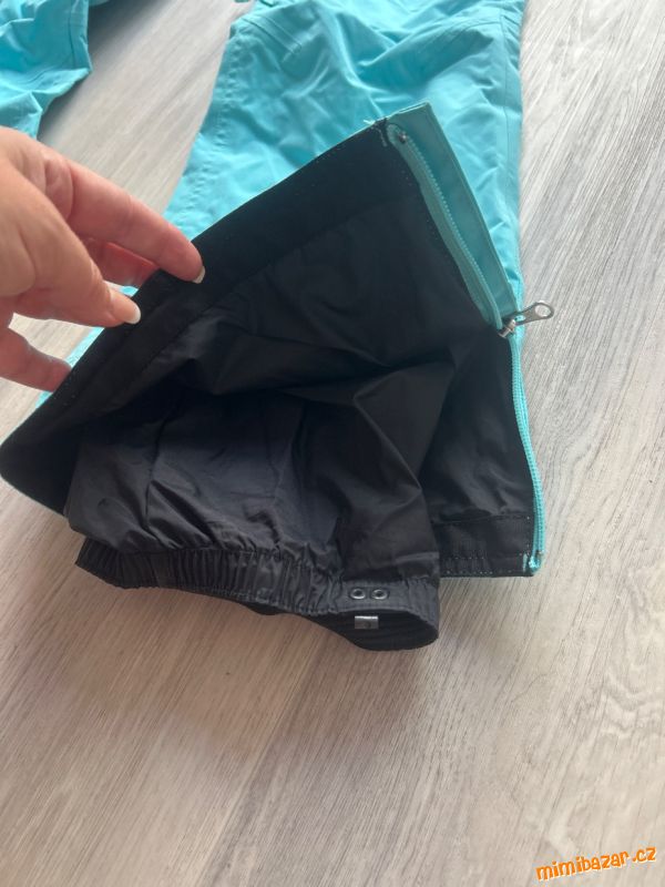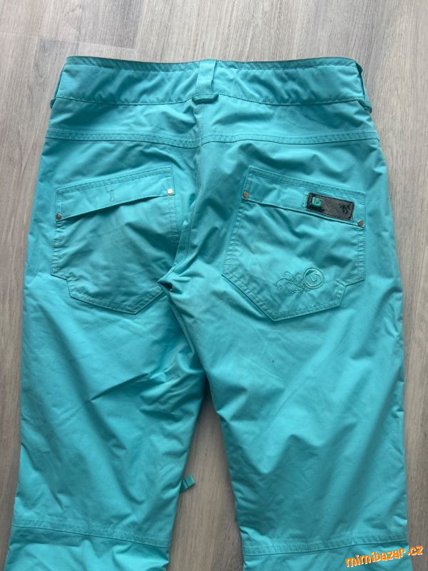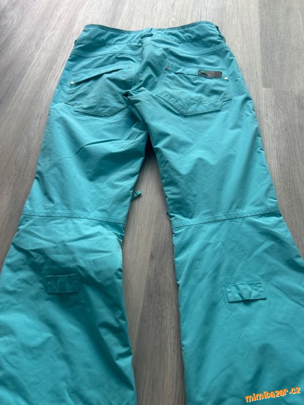 Prodám používáme lyžařské nebo snowboardové kalhoty tyrkysové barvy. Sem tam flíček.