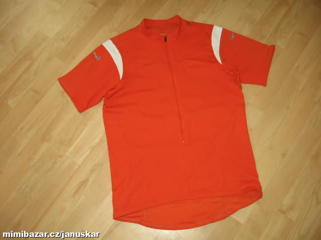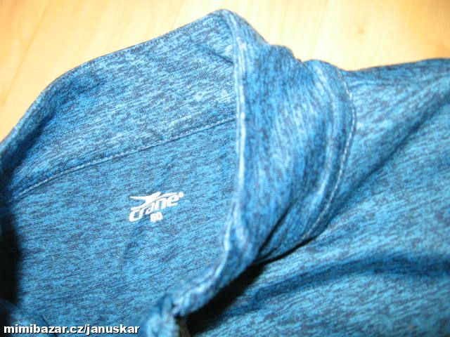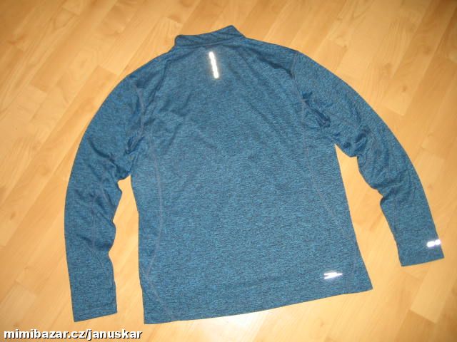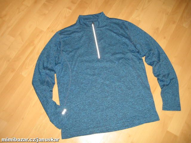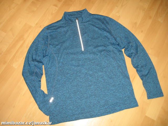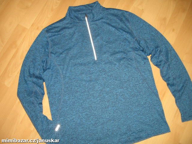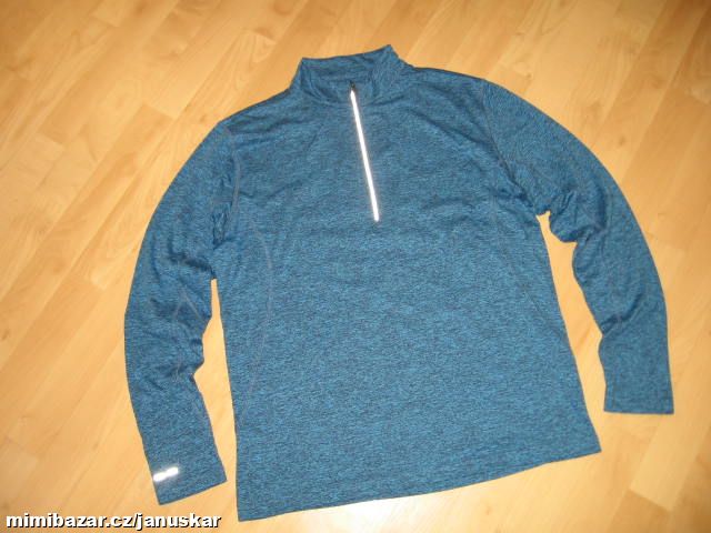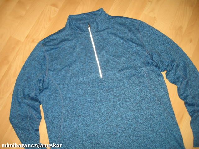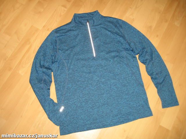 Jako nové, lehký a příjemný funkční materiál / 100% polyester, uvedená velikost 50, odpovídá M/L , délka 68cm, průramky 54cm, rukávy od krku 77cm, u krku na zip, výrazné reflexní prvky (na fotu vidět jako bílé - osvíceno bleskem), modré melírované..