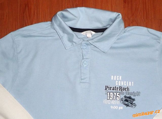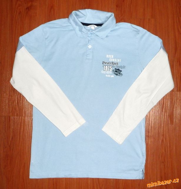 Prodám chlapecké tričko, vel. značená 158-164, odpovídá vel. 158, zn. TCM. Světle modré, efekt bílých dvojitých rukávů, u krku rozhalenka na knoflíky s límečkem. Nahoře ozdobná nášivka s pirátskými motivy, na bocích v lemu rozparky. Materiál 100% bavlna.…