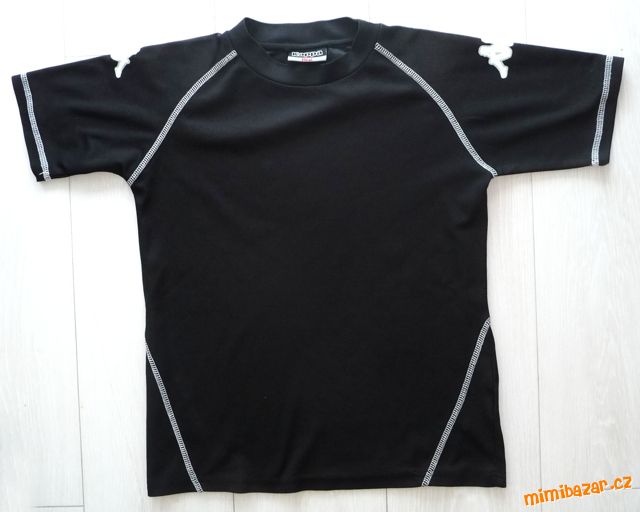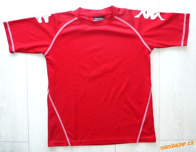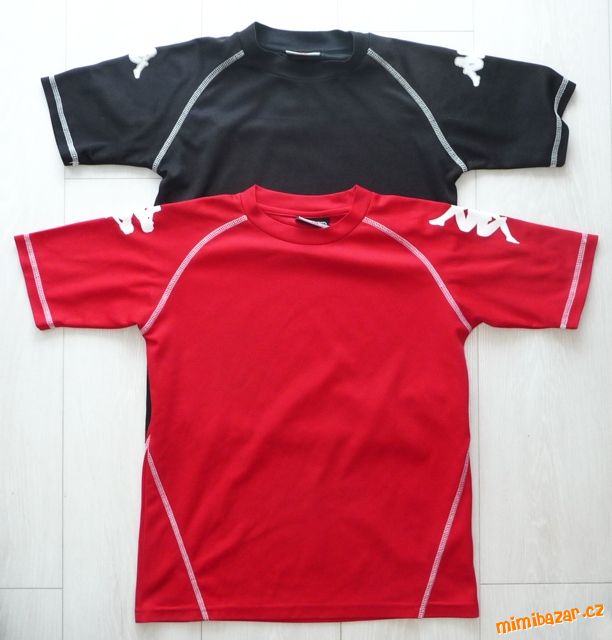 Prodám dvě sportovní trička/dresy, vel. značená 152, odpovídají ale vel.128-134, zn. Kappa. Jedno černé s bílými detaily, druhé červené s bílými detaily. Výrazně prošité bílé švy, na ramenou logo Kappa. Příjemný kvalitní funkční materiál 100% polyester, nemačká se, nežehlí se, ideální na všechny sportovní aktivity, na tělocvik. Červené délka 56cm, šířka 42cm. Černé délka 54,5cm, šířka 41cm. Velmi pěkný stav, bez flíčků a děr, každé má pár žmolíků, ale celkově stále pěkná. Cena 120Kč/ks + 39Kč poštovné obyčejně nebo + 87Kč doporučeně nebo 75Kč Balíkovna, prodej možný i jednotlivě.