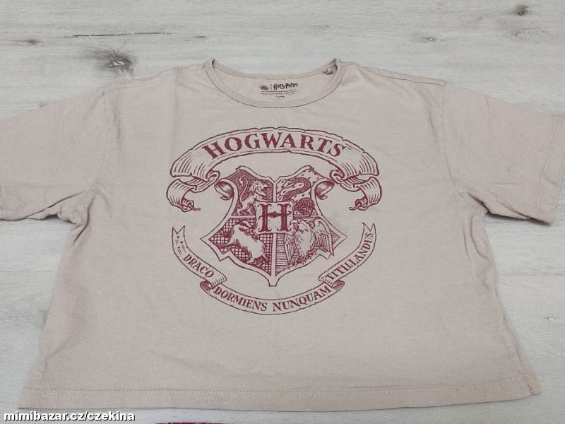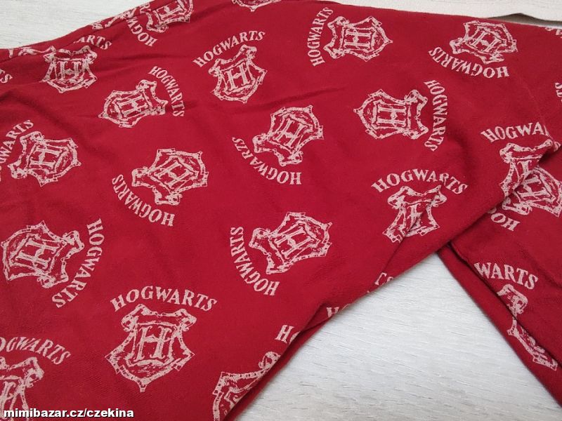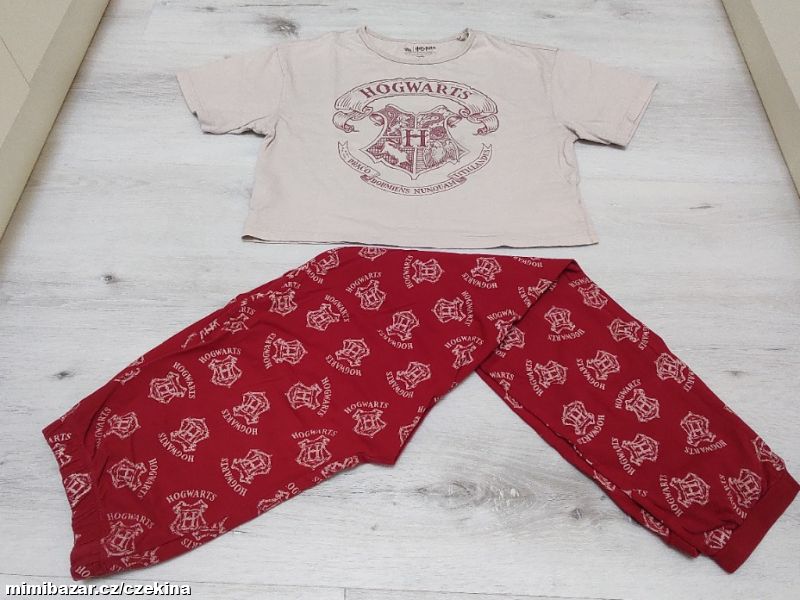 Krásné pyžamko s motivem Harryho Pottera. Kratší crop tričko s krátkým rukávem, kalhoty se širokou plochou gumou v pase. Nošené, v moc pěkném stavu.