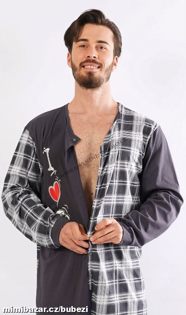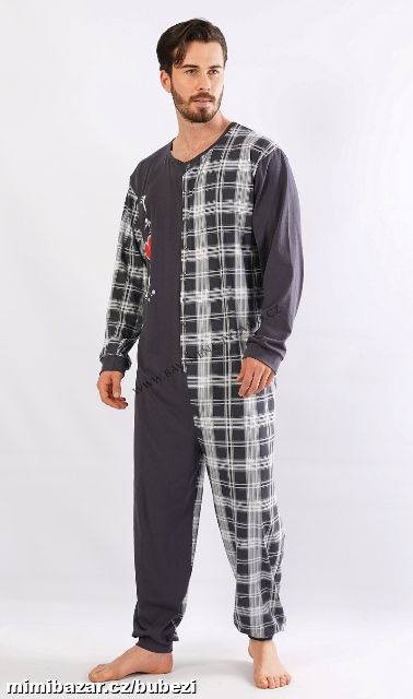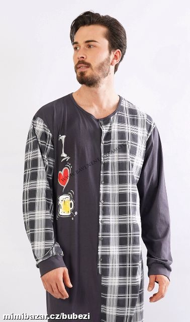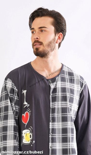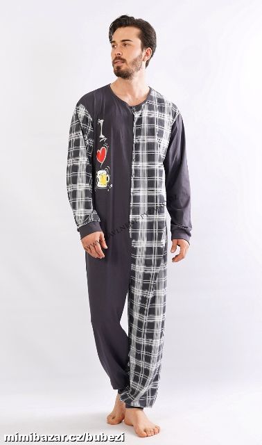 Pánský overal I love Beer. Pánský celopropínací overal s dlouhými rukávy se pohledově skládá z jednobarevné a kárované části. Na jednobarevné části je nápis I love Beer složený ze srdíčka, půllitru piva a písmenka I. Zádní strana overalu je károvaná. Použitý materiál je jemný a poddajný na dotek. Pyžamo je vhodné i na denní nošení.