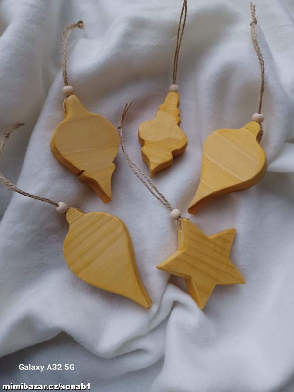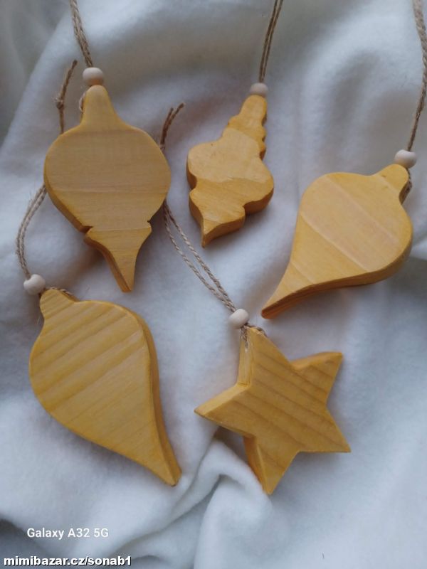 Vánoční ozdoby na stromeček ze smrkového dřeva, v přírodních barvách,ozdoby si sama vyřezávám a ručně maluji. Ozdoby mají jutový provázek na zavěšení. Velikost je cca 8x4cm a tloušťka 1,5 cm. Cena je za 5 kusů. Každý kus je originál, díky kresbě dřeva.