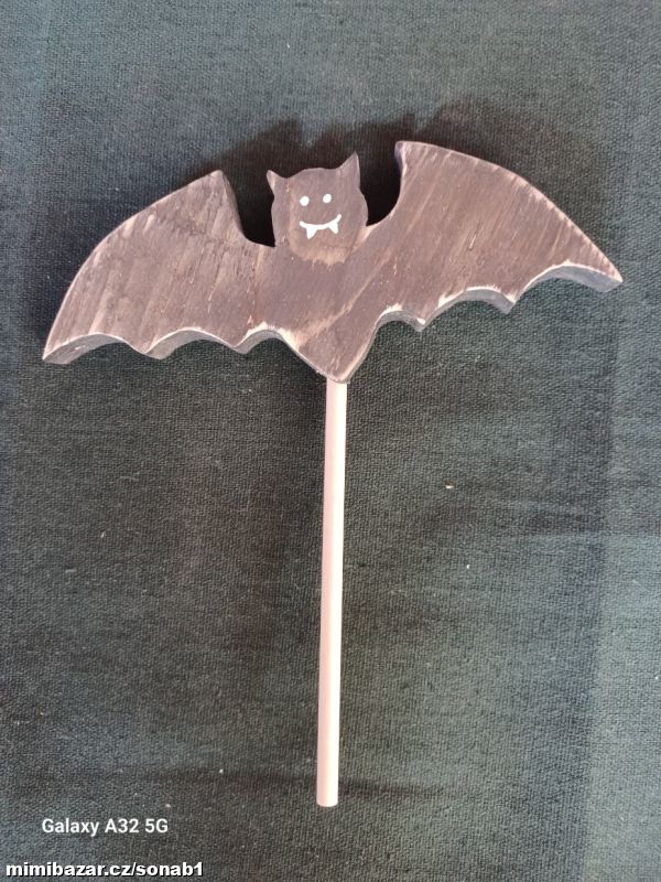 Dřevěný netopýrek z mé dílničky určitě nesmí chybět v podzimním truhlíku nebo květináči :)). Je ze smrkového dřeva a mnou vyřezávaný a ručně malovaný. Velikost je cca křídla 16cm a výška je cca 6cm. Materiál je smrkové dřevo.