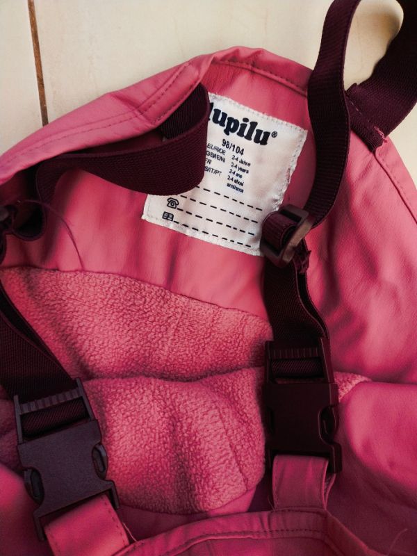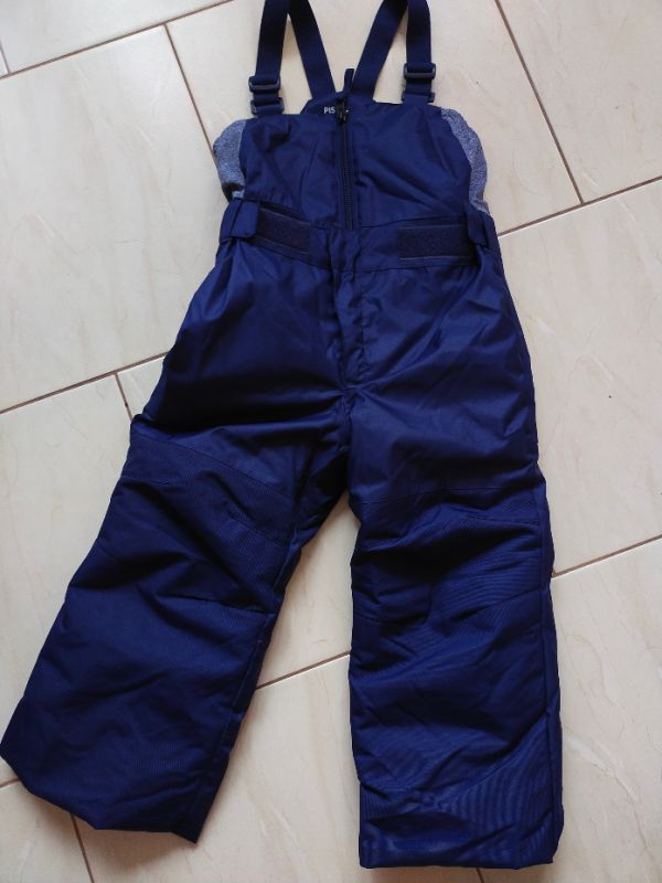 Dívčí kalhoty podšité flísem, regulovatelné kšandy, dole gumy na boty, v pase regulace šířky na patentek, super stav, reflexní prvky. Vzadu štítek na jméno, nepopsané. Lomená velikost 98/104.