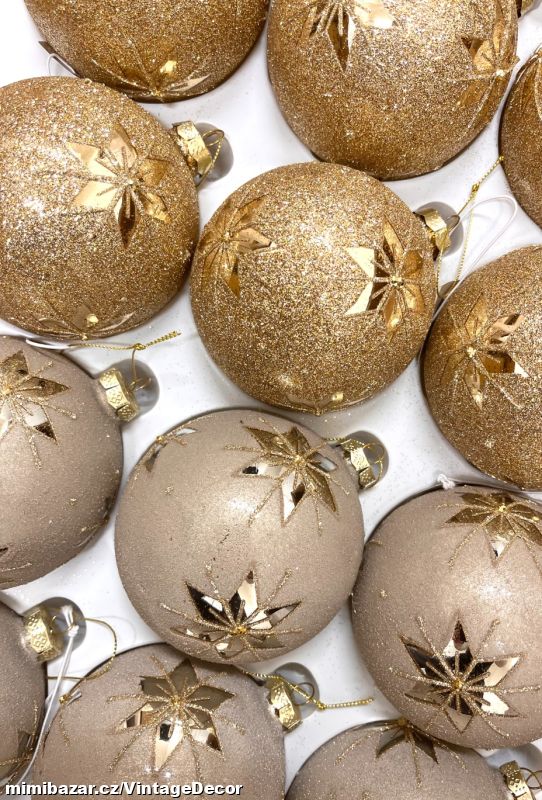 Luxusní skleněné foukané baňky o průměru 10 cm, zlatá a kapučínová barva s aplikací zlatých hvězdiček