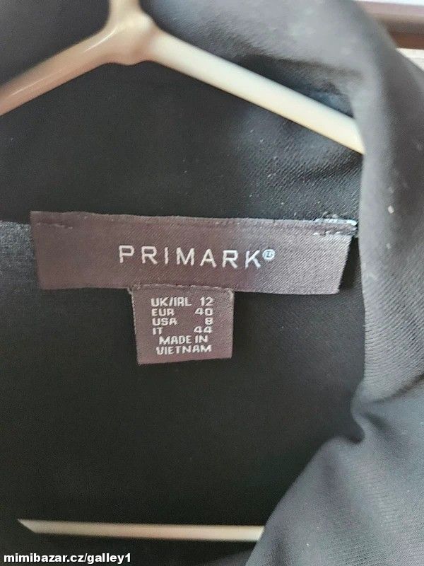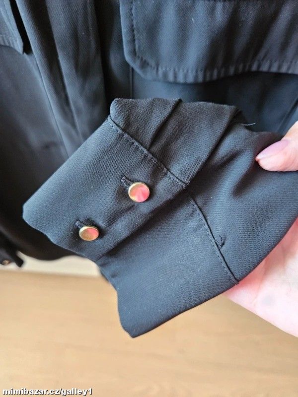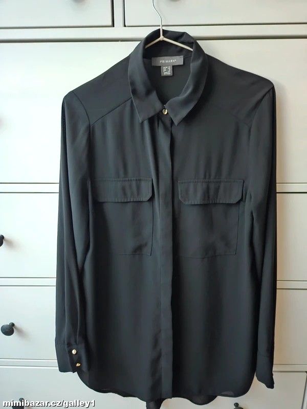 Černá, šifonová, volná košile, značka Primark, velikost 40, není úplně průhledná, zlaté knoflíčky u krku a na rukávech, lehká, bez vady