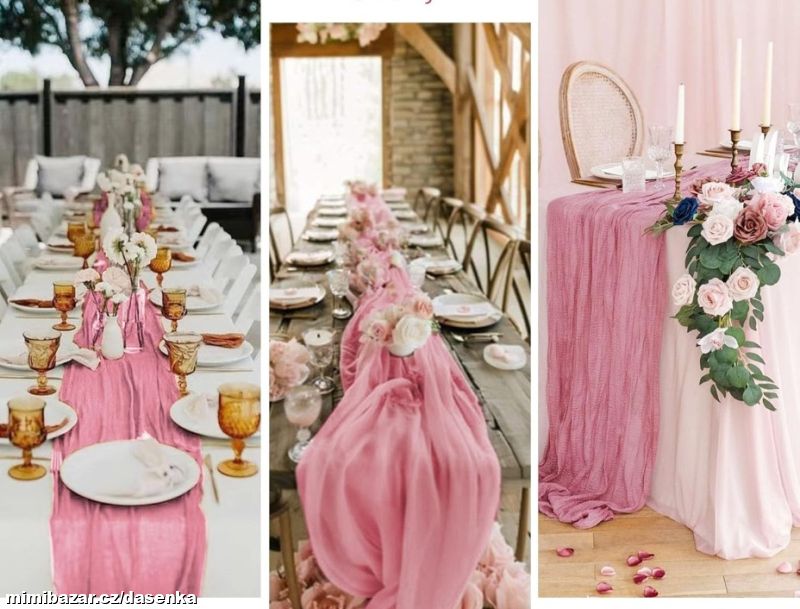 Boho běhoun z gázoviny na slavnostní stůl nebo slavobránu 90 x 300cm růžový.