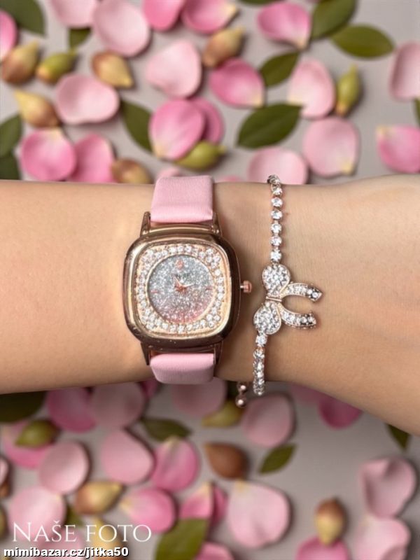 Hodinky mají třpytivý ciferník zdobený čirými kamínky, zatímco náramek doplňuje elegantní vzhled jemným leskem. Set působí ženským, elegantním dojmem a je skvělou volbou pro každodenní nošení i jako dárek.