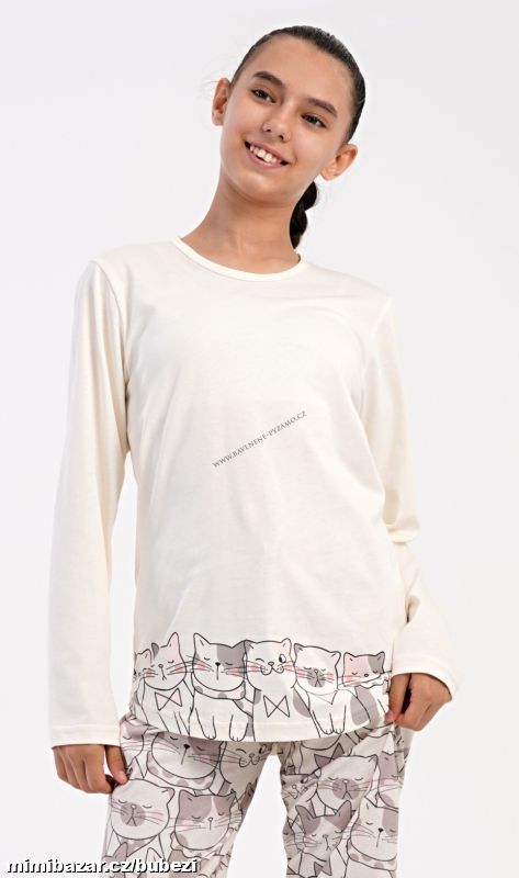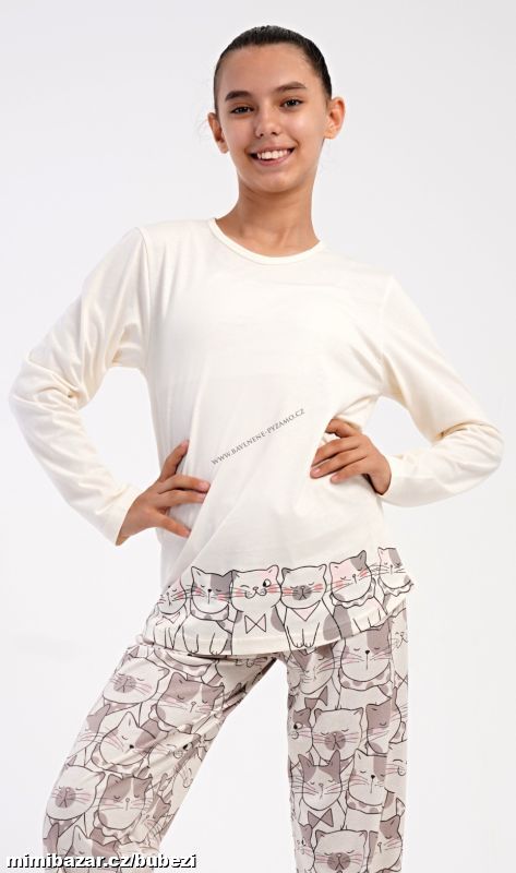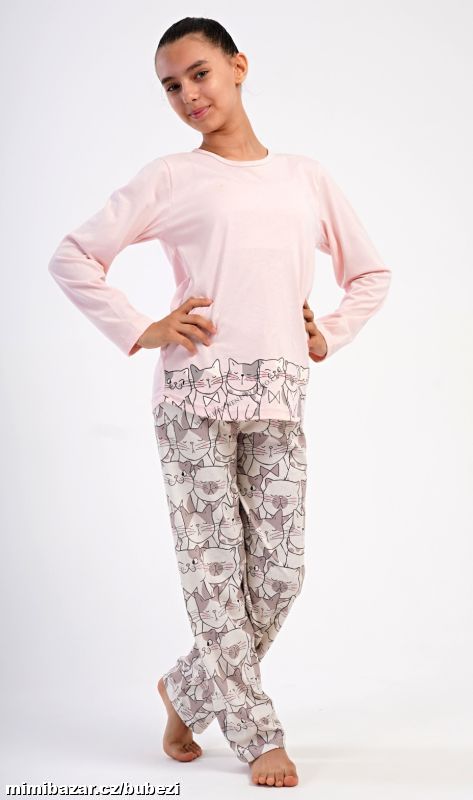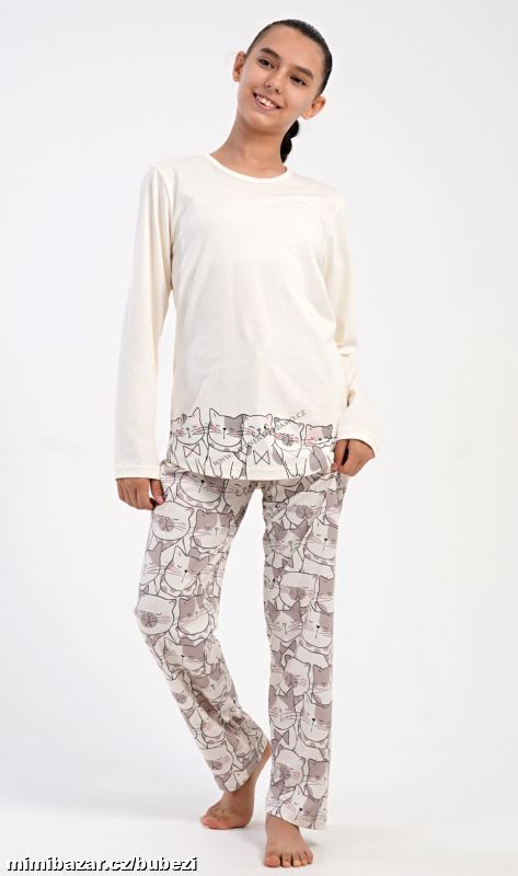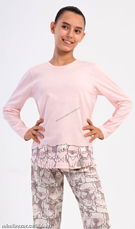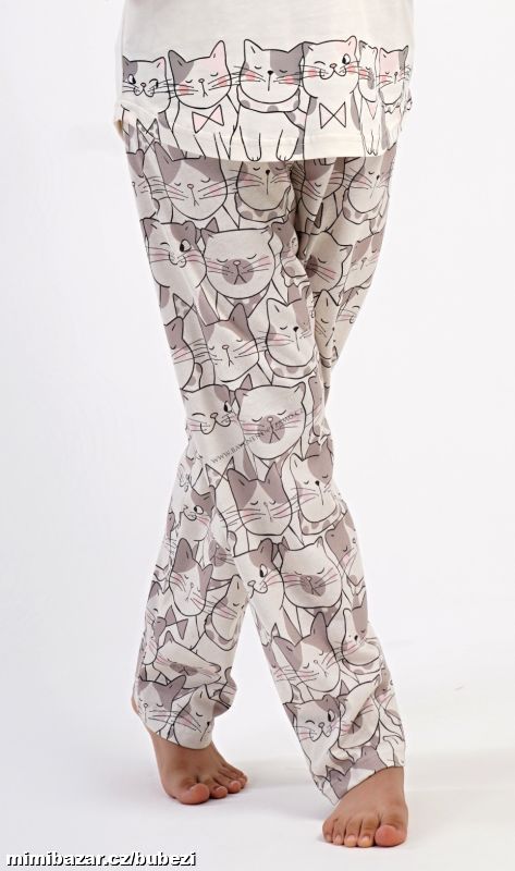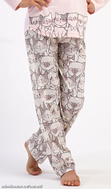 Dětské bavlněné dlouhé pyžamo Koťata. Dívčí pyžamo se skládá z trika s dlouhým rukávem a dlouhých kalhot. Triko s kulatým výstřihem je ozdobeno obrázky koček. Tento motiv se opakuje i na kalhotách, které mají v pase gumu a šňůrku na stažení, nemají kapsy. Použitý bavlněný materiál je poddajný a příjemný na dotek.