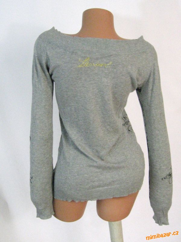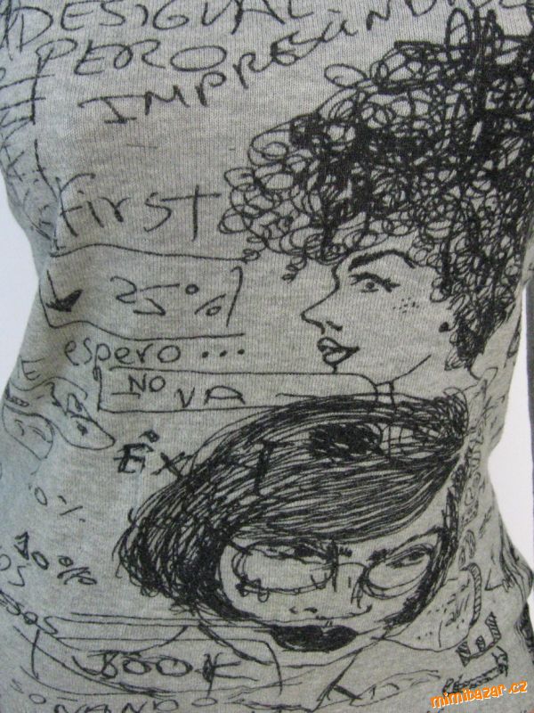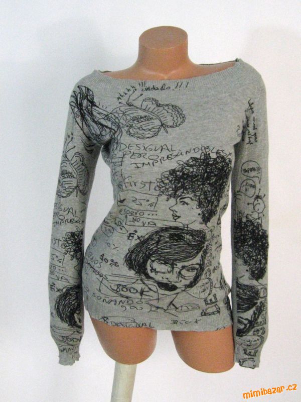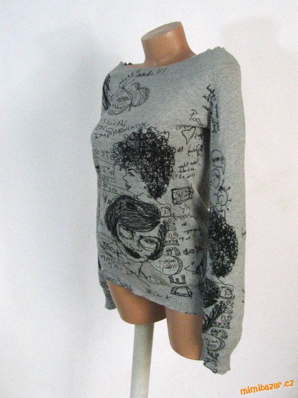 Svetr je nošený a v pořádku. Šedá barva s černými ornamenty. Lehoučký materiál.
