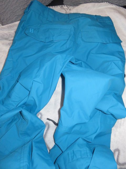 Lyžařské,snowboardové kalhoty krásné tyrkysové barvy,v nohavicích zábrana proti vniknutí sněhu,z boku rozparek,v pase regulace such.zipem,z boku kapsy na zip a postranní kapsy, v rozkroku větrací otvory,nošené,spodek nohavic ok,drahá značka.