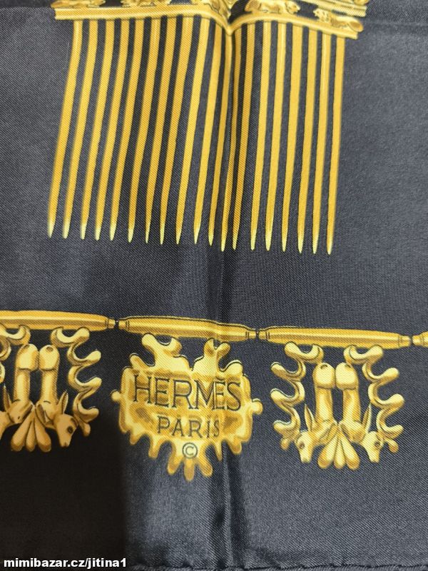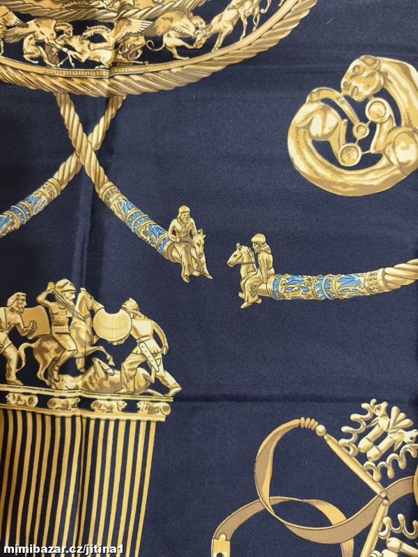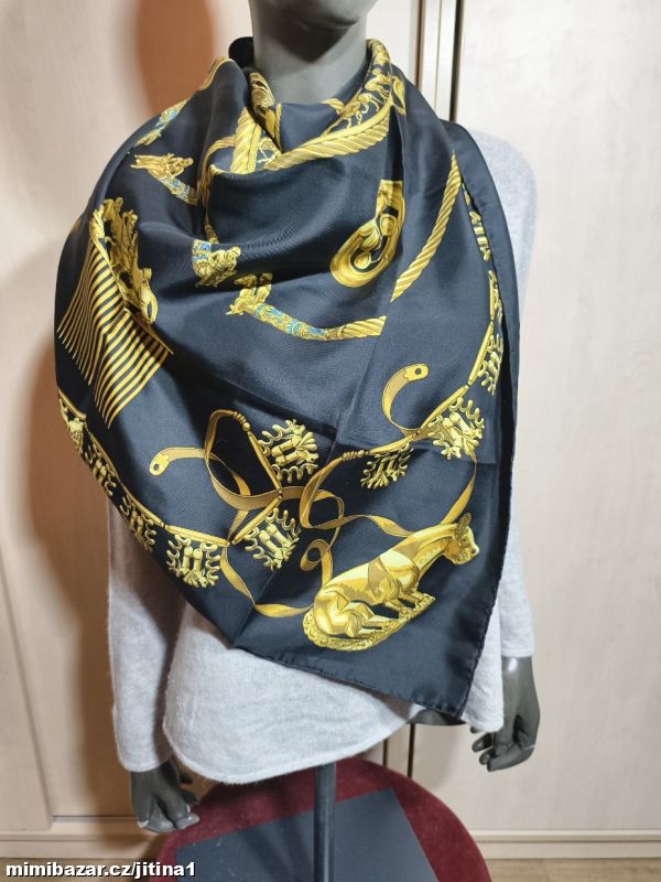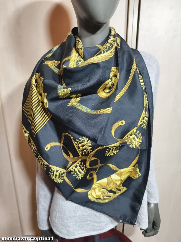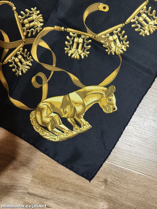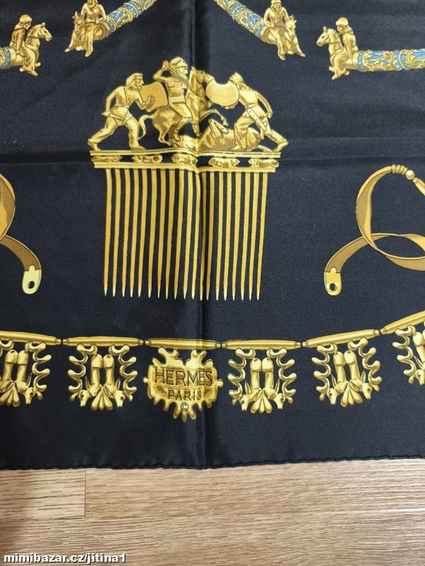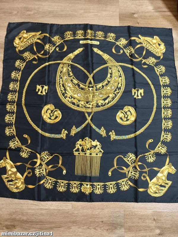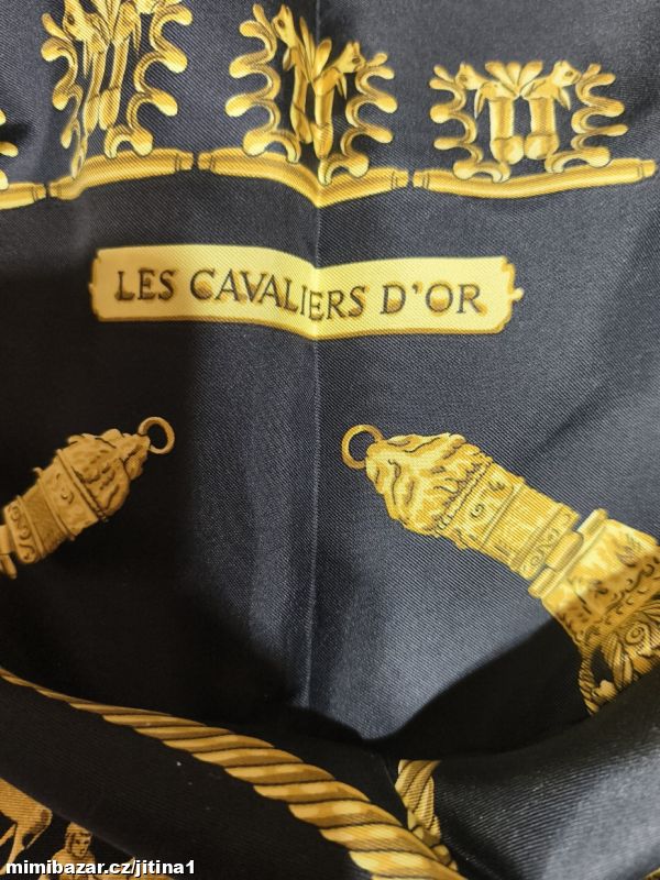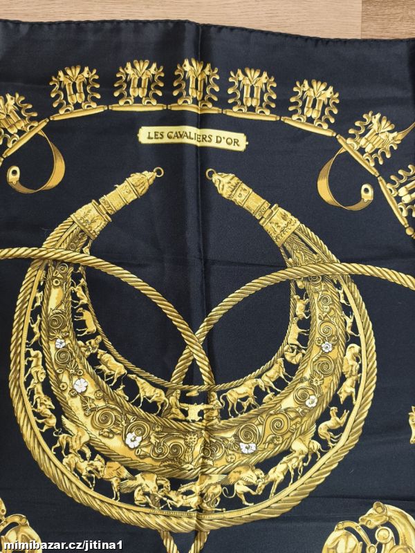 Hedvábný šátek Les Cavaliers D´or navrhl Vladimír Rybaltchenko, známý také jako Rybal, šátek byl poprvé vydán v roce 1975-.Vladimír rybal /1939-2002¨/ byl prasynovec Philippa Ledouxe a otec Dimitrije Rybaltchenka , všichni byli renomovaní umělci Hermés. Toto je vzácný hedvábný šátek černo zlatý , ručně rolované a šité okraje, kvalitní hedvábí. Doporučuji i jako sběratelský kousek i jako nadčasový krásný kvalitní šátek