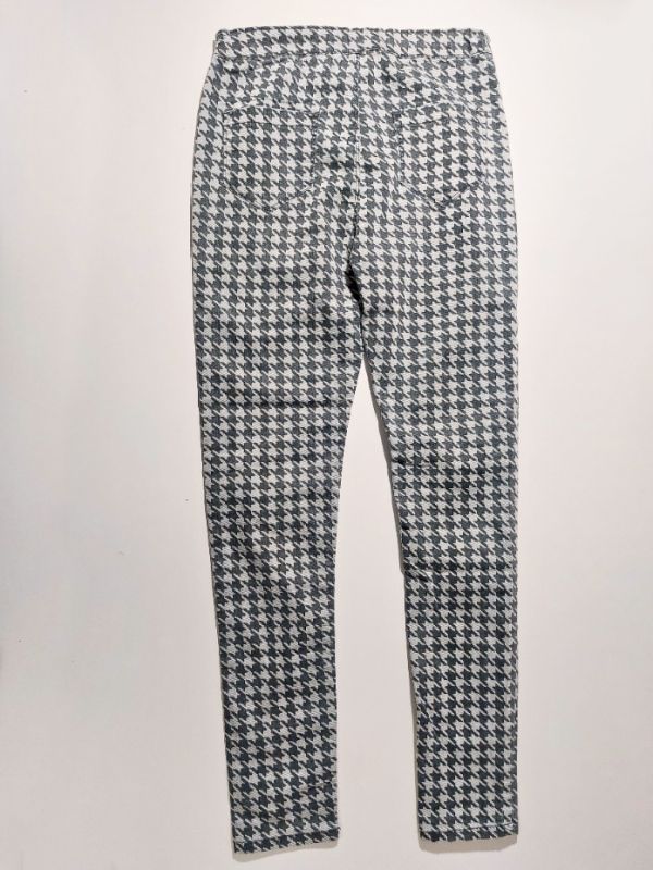 Prodám krásné nošené džíny Candy Couture vel. 15yrs. Černo šedý vzor kohoutí stopy, slabší poddajná pružná džínovina složení 65% bavlna 33% polyester 2% elastan, v pase regulace z rozpínání na kovový knoflík a zip, vzadu kapsy. Moc pěkný stav bez vad. Délka 96cm, šířka v pase max.35cm.